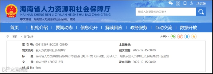 12月15日,海南省人力资源和社会保障厅等四部门修订印发了《实习生、见习人员、超龄从业人员参加工伤保险办法》(琼人社规〔2025〕8号,以下简称《办法》),自2026年1月1日起施行。