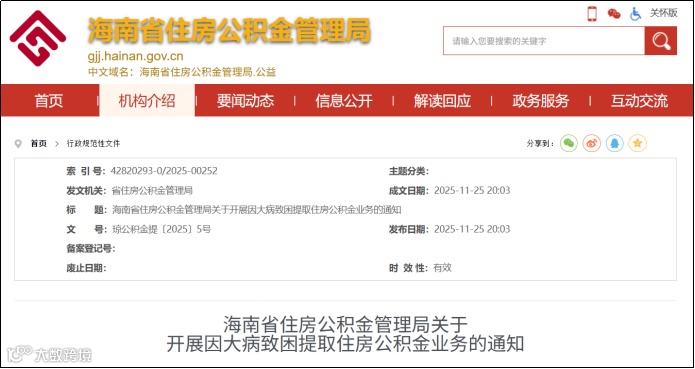 11月25日,海南省住房公积金管理局发布《关于开展因大病致困提取住房公积金业务的通知》,从12月1日起,海南省住房公积金缴存人因家庭成员患大病造成的家庭生活困难,可提取公积金。