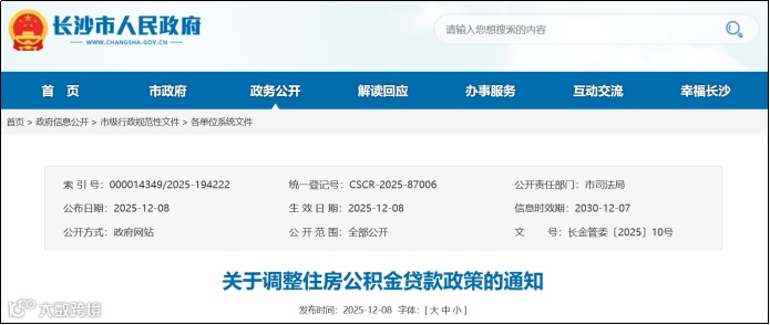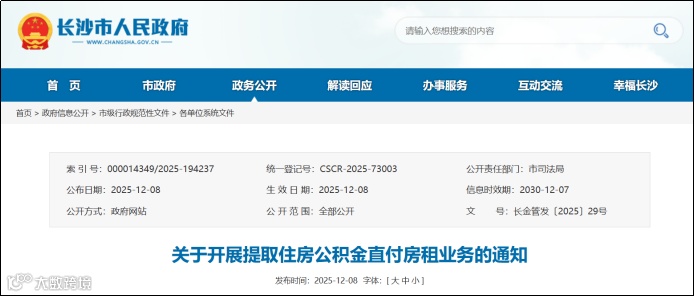 12月8日,长沙市住房公积金管理委员会印发《关于调整住房公积金贷款政策的通知》、《关于开展商业银行住房贷款转住房公积金组合贷款业务的通知》、《关于开展提取住房公积金直付房租业务的通知》,均自2025年12月8日起施行。