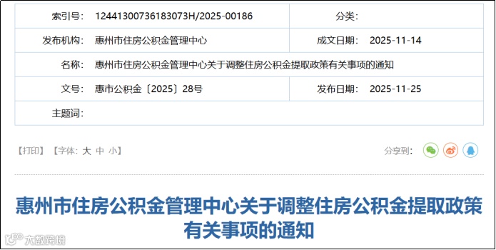 11月25日,惠州市住房公积金管理中心发布《关于调整住房公积金提取政策有关事项的通知》,对住房公积金提取政策作出优化调整,新政策于2025年12月1日起正式实施。
