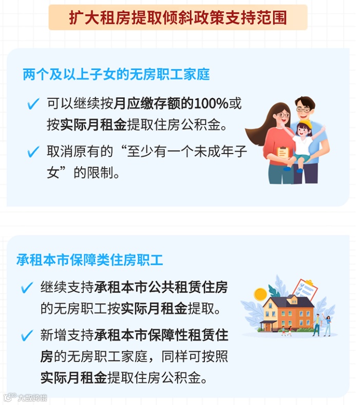 继续实施对多子女家庭租房提取的倾斜政策,取消多子女家庭提取住房公积金要求“至少有一个未成年子女”的条件;