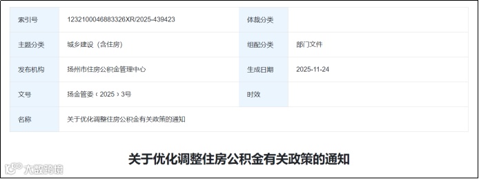 11月28日,扬州市住房公积金管理委员会发布《关于优化调整住房公积金有关政策的通知》,通知自2025年12月1日起施行。