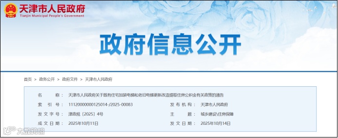 10月14日,天津发布《关于既有住宅加装电梯和老旧电梯更新改造提取住房公积金有关政策的通告》,自10月14日起施行,有效期5年。