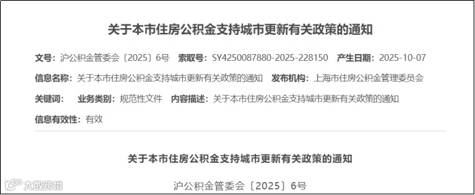 上海市住房公积金管理委员会10月7日发布《关于本市住房公积金支持城市更新有关政策的通知》,自2025年10月7日起施行,有效期五年。