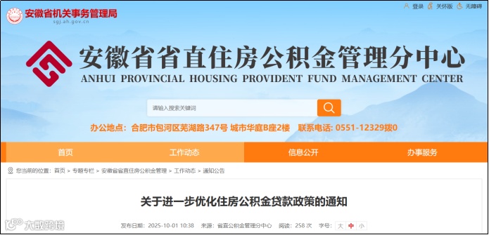 10月1日,安徽省住房公积金管理中心发布《关于进一步优化住房公积金贷款政策的通知》,自2025年10月1日起施行,有效期5年。