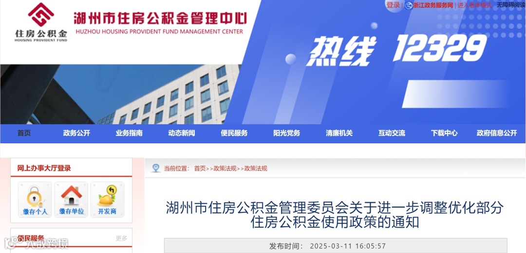 3月11日,湖州市住房公积金管理委员会发布《关于进一步调整优化部分住房公积金使用政策的通知》,该通知自2025年3月15日起执行,进一步加大住房公积金使用政策支持力度。