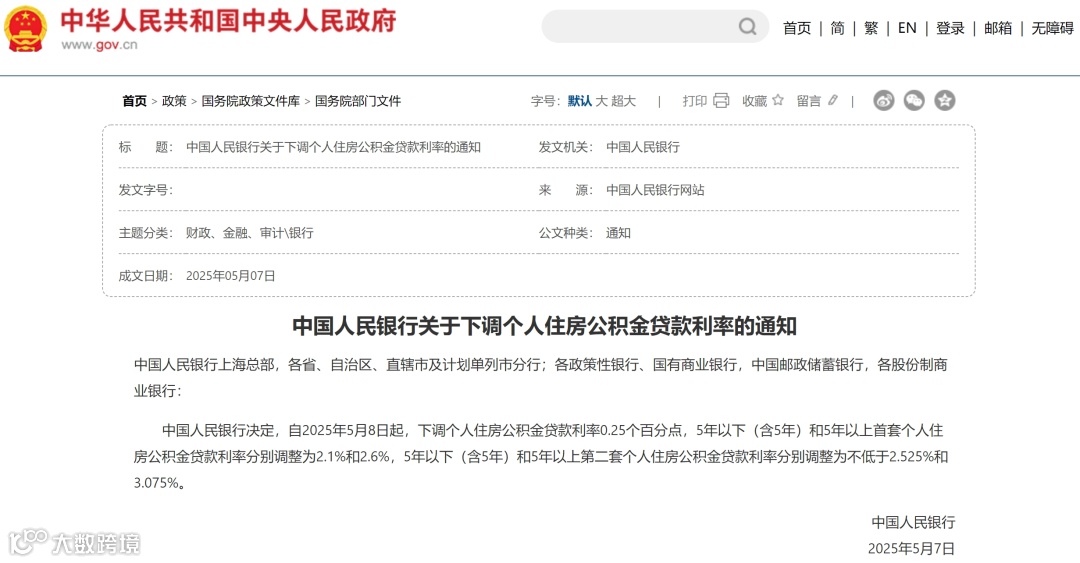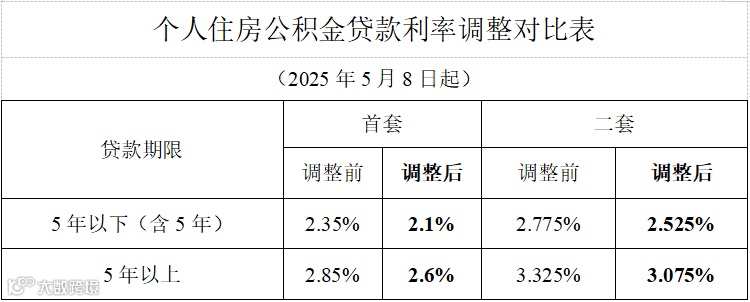 5月7日,中国人民银行发布关于下调个人住房公积金贷款利率的通知:自2025年5月8日起,下调个人住房公积金贷款利率0.25个百分点。