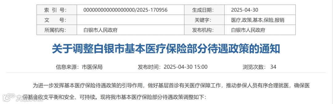 4月30日,白银市医保局发布《关于调整白银市基本医疗保险部分待遇政策的通知》,该通知自2025年5月1日起执行。