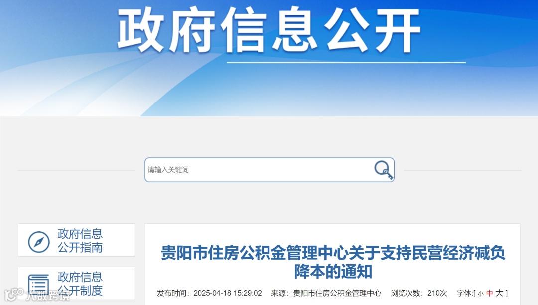 4月18日,贵阳市住房公积金管理中心发布《关于支持民营经济减负降本的通知》,该通知于2025年5月1日起开始执行