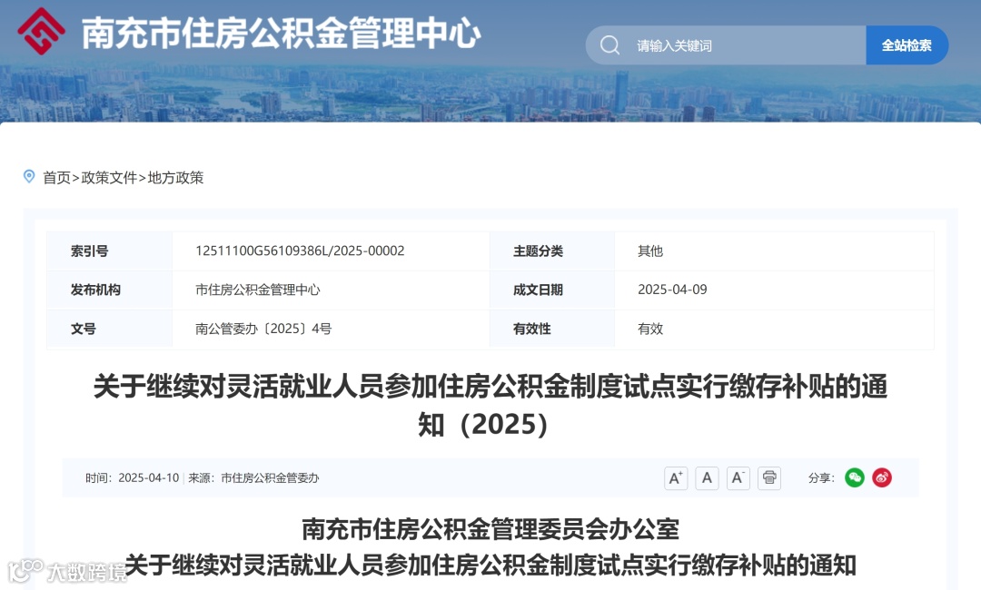 4月27日,乐山市住房公积金管理中心发布《乐山市灵活就业人员参加住房公积金制度试点实施细则》,自2025年5月1日起施行,有效期5年。