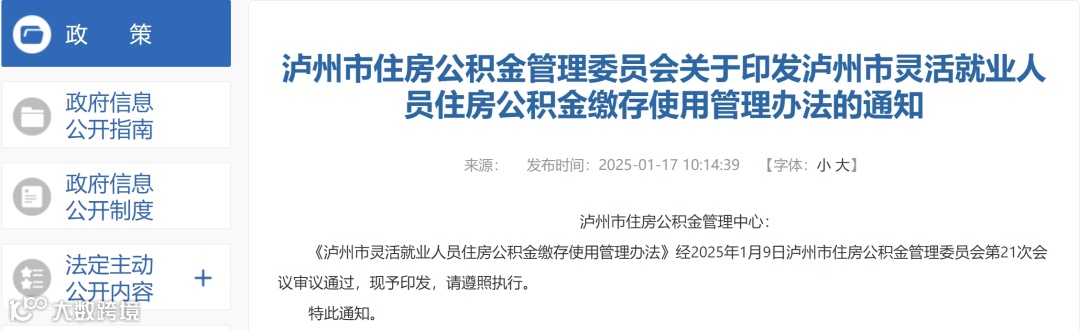 近日,泸州市住房公积金管理委员会发布《关于印发泸州市灵活就业人员住房公积金缴存使用管理办法的通知》,自2025年5月1日起施行,有效期5年。届时,灵活就业人员可设立住房公积金个人账户,并享受缴存、提取、贷款等政策。