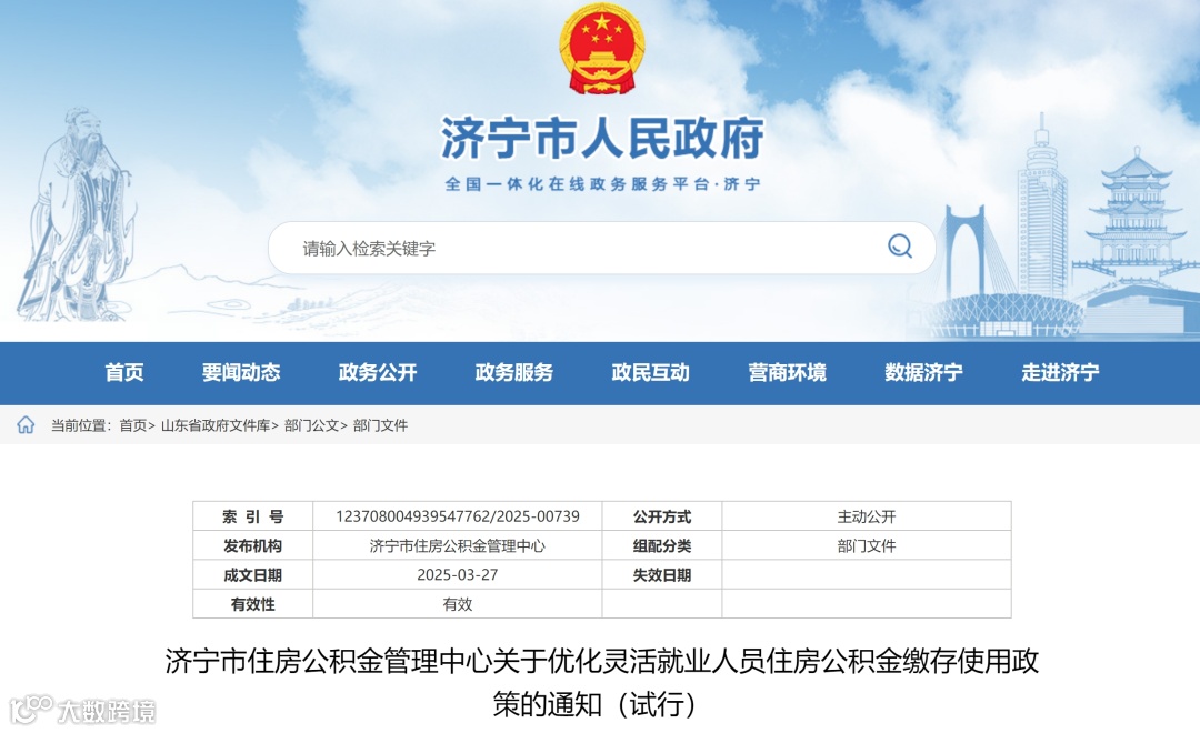 3月27日,济宁市住房公积金管理中心发布《关于优化灵活就业人员住房公积金缴存使用政策的通知(试行)》,自2025年5月1日起施行,未涉及的灵活就业人员住房公积金政策按原政策执行。