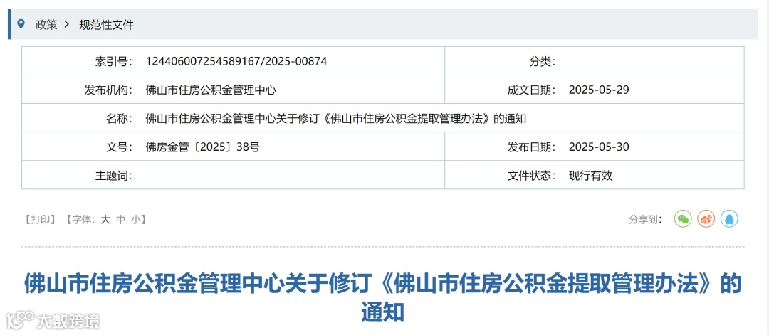 5月30日,佛山市住房公积金管理中心发布关于修订《佛山市住房公积金提取管理办法》的通知,取消部分情形户籍地提取限制、租房提取额度提高、延长提取时限等。自2025年7月1日起施行,有效期5年。