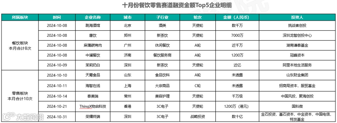 餐饮和电商零售行业本月共计完成18次融资,融资次数较上月略有增长。餐饮零售赛道融资金额TOP5企业明细如下: