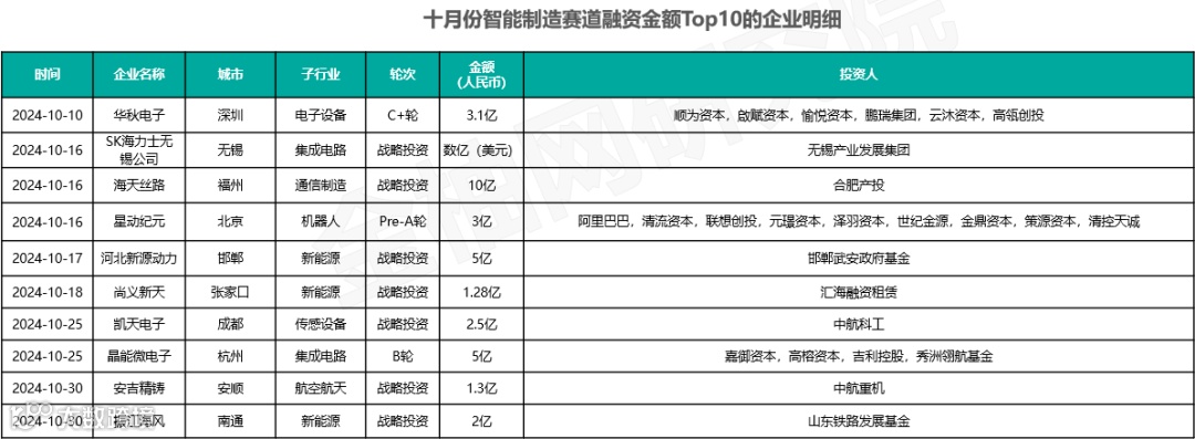 2024年10月份,智能制造领域共计完成85次融资,较上个月下降。本月融资次数最高的是集成电路赛道完成的17次融资,其次是机器人赛道完成的15次融资。本月融资金额最高的是通信制造赛道的海天丝路完成的10亿元人民币战略融资。