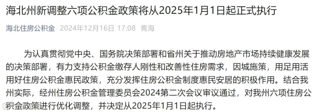 12月16日,“海北住房公积金”公众号发布消息,青海省海北藏族自治州新调整六项公积金政策将从2025年1月1日起正式执行。