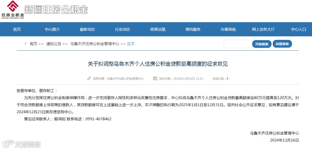 12月16日,乌鲁木齐住房公积金管理中心发布《关于拟调整乌鲁木齐个人住房公积金贷款最高额度的征求意见》。