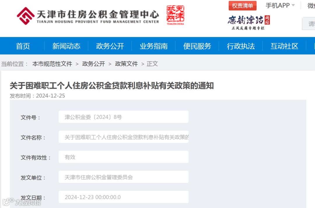 近日,天津市住房公积金管理中心发布《关于困难职工个人住房公积金贷款利息补贴有关政策的通知》,该通知自2025年1月1日起施行,有效期5年。