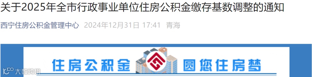 2024年12月31日,西宁住房公积金管理中心公众号发布《关于2025年全市行政事业单位住房公积金缴存基数调整的通知》,调整2025年行政事业单位住房公积金缴存基数。