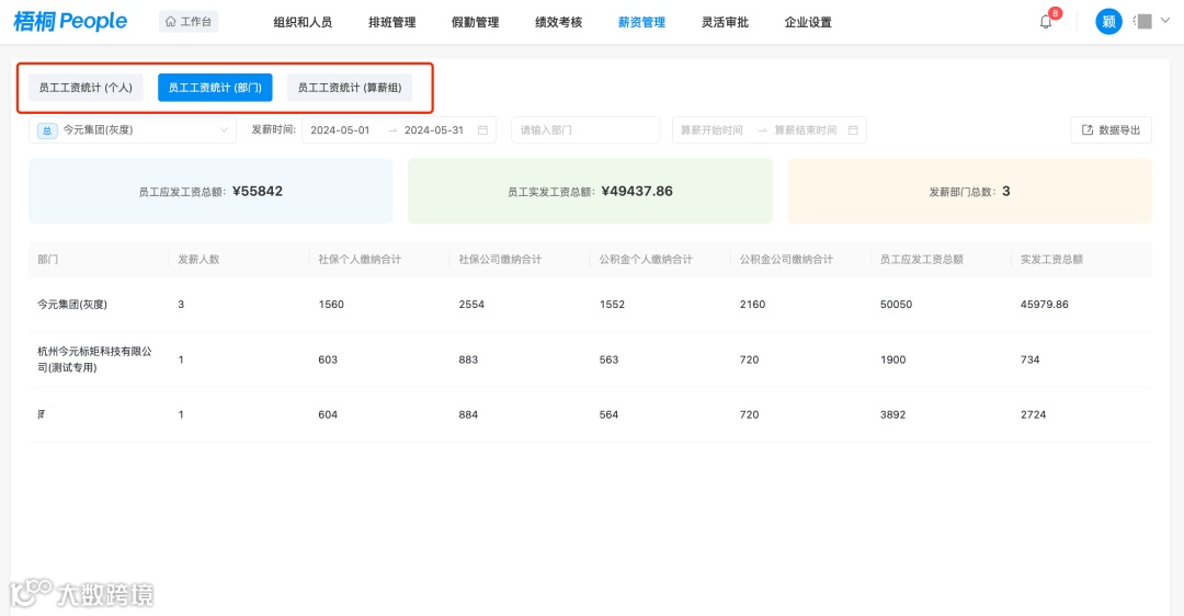 「梧桐People」的薪资统计模块不仅精准呈现年度用人成本全貌、各部门成本明细以及不同岗位成本数据,还帮助企业管理者快速洞悉用人成本关键,及时察觉问题与优化契机,为人力资源战略、成本管控及运营管理筑牢数据根基,推动企业人力价值与经济效益协同增长。
