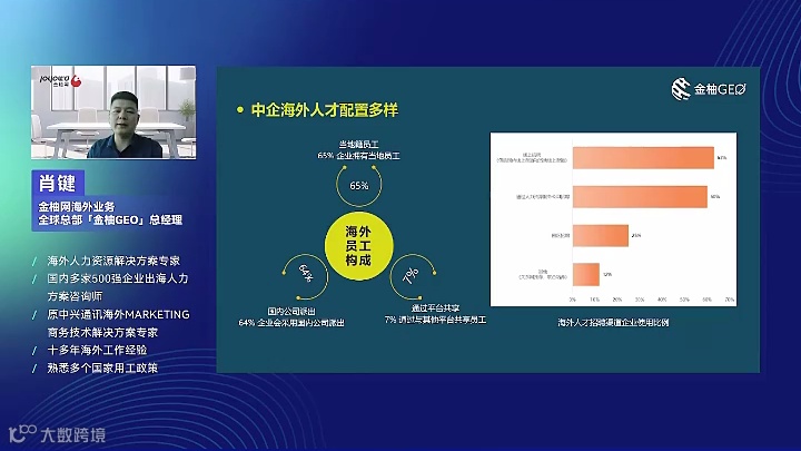 金柚网海外业务全球总部「金柚GEO」总经理肖键以《打破国界,如何让全球步伐走的更稳健》为主题,深入介绍中国出海企业整体概况、中企海外用工特点和方式,深入分享全球HR解决方案以及企业出海的成功案例和最佳实践,为出海浪潮下的企业提供更全面的用工参考。