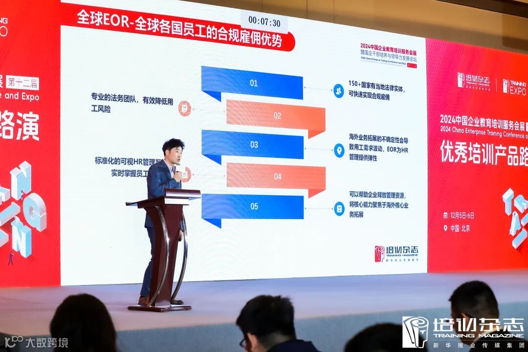 12月5-6日,由新华报业传媒集团《培训》杂志主办的“2024中国企业教育培训服务会展”在北京隆重举行。金柚GEO深度分享一站式全球人力资源解决方案及实践成果,并在产品路演活动中荣获“优秀培训产品”奖。