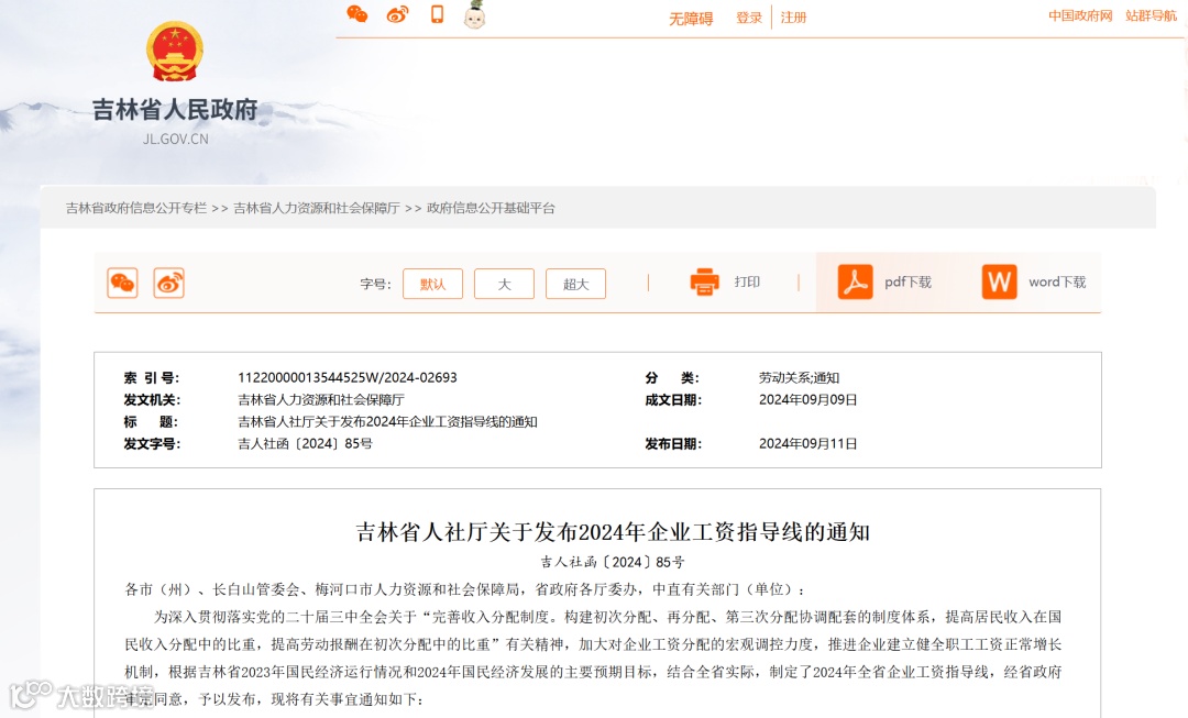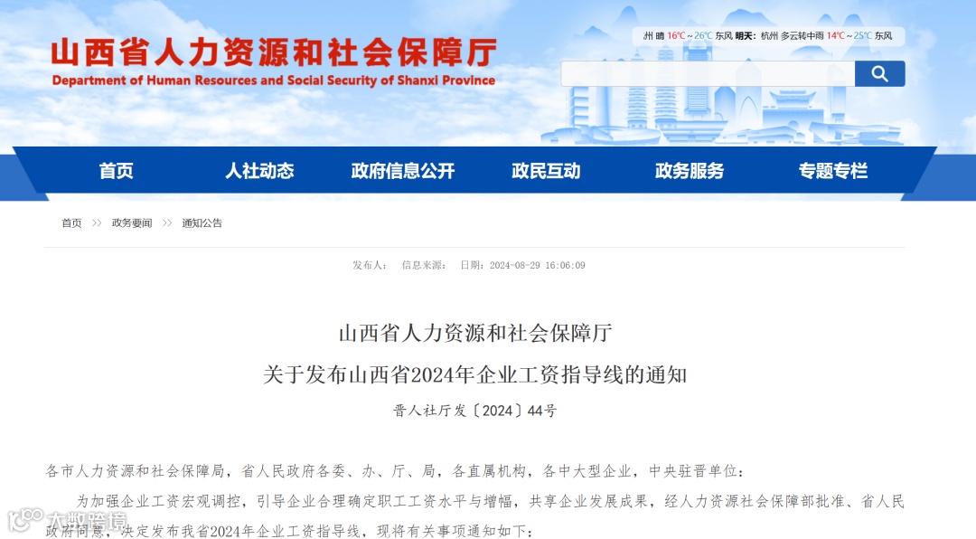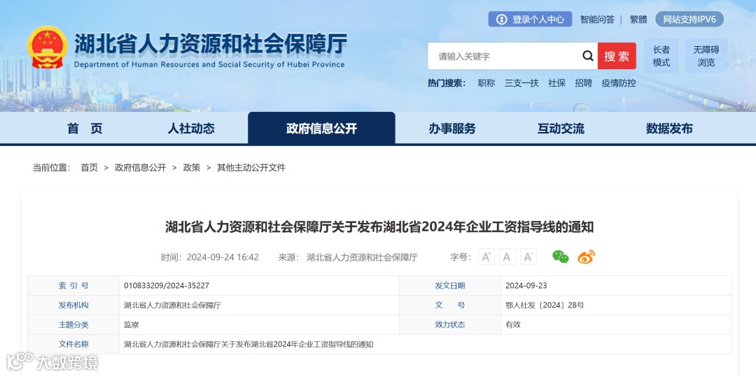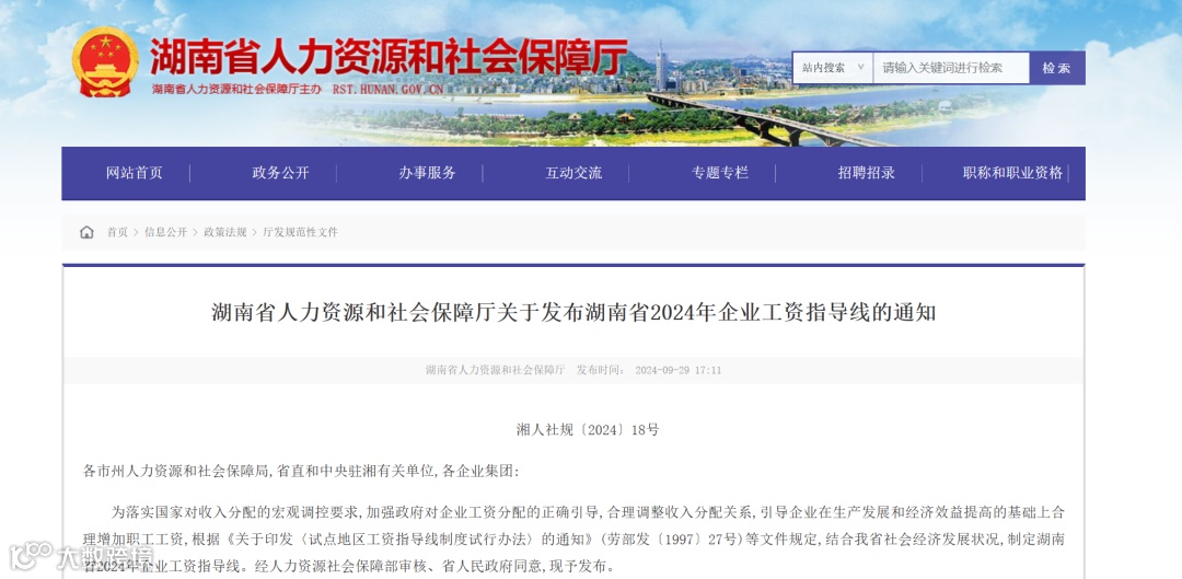 湖北省人社厅网站发布《关于发布湖北省2024年企业工资指导线的通知》,明确全省企业职工货币工资增长基准线为6%,下线为3.5%。