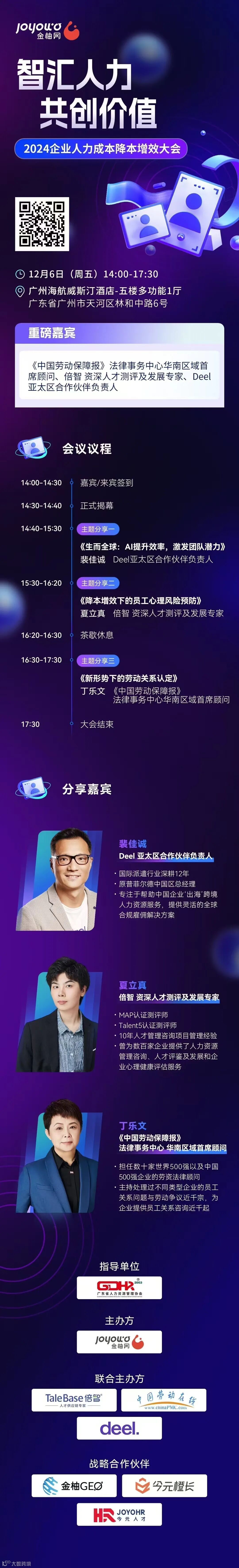 12月6日(本周五),由广东省人力资源管理协会指导,金柚网主办,倍智、中国劳动在线、Deel联合主办的2024企业人力成本降本增效大会即将在广州的海航威斯汀酒店盛大开启。