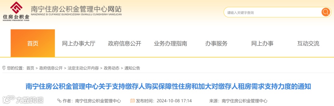 10月8日,南宁住房公积金管理中心发布《关于支持缴存人购买保障性住房和进一步加大对缴存人租房需求支持力度的通知》,该通知自印发之日起实施,有效期二年。