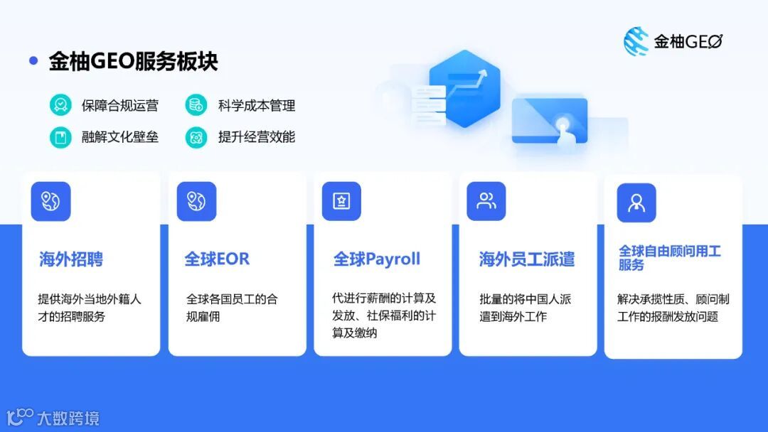 金柚GEO作为金柚网与光谷人才集团合资成立的金柚网海外人力资源业务全球总部,致力于提供全球数字化人力资源服务,助力企业快速拓展海外市场并稳健发展海外业务。涵盖海外招聘、全球EOR、全球Payroll、海外员工派遣、全球自由顾问用工等一站式全球雇佣服务,服务覆盖亚太、美洲、欧洲、中东、非洲等多个地区,支持超过150个国家和地区的业务需求。