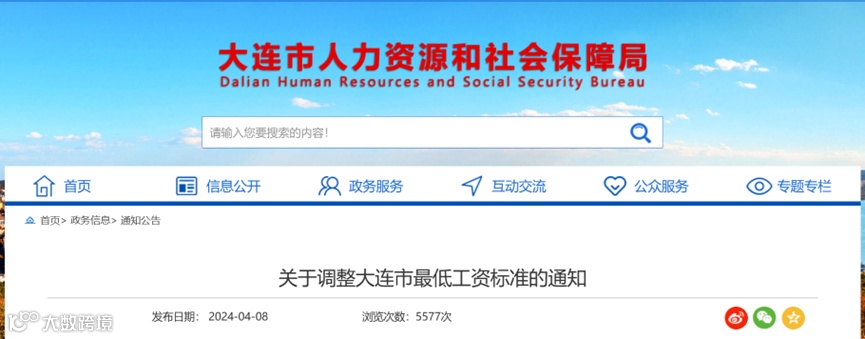 大连市人力资源和社会保障局根据《辽宁省人力资源和社会保障厅关于调整全省最低工资标准的通知》(辽人社发〔2024〕1号)精神,上调全市最低工资标准。调整后的最低工资标准从2024年5月1日起执行。