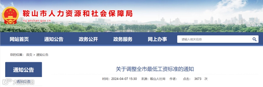 鞍山市人力资源和社会保障局发布《关于调整全市最低工资标准的通知》,对全市最低工资标准进行调整。调整后的最低工资标准从2024年5月1日起执行。