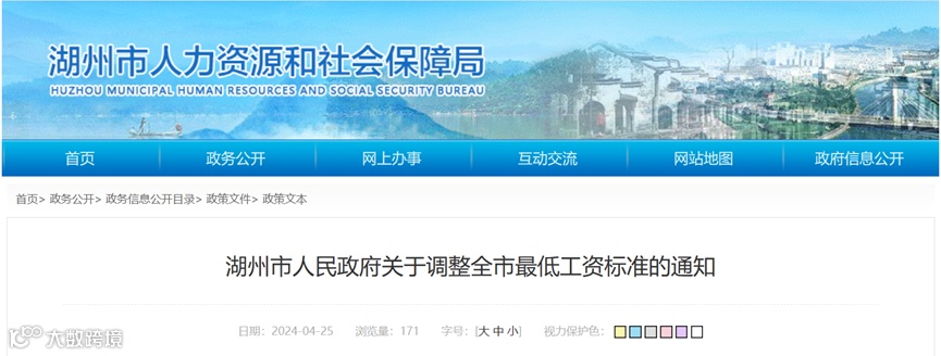 4月26日,湖州市人民政府发布《关于调整全市最低工资标准的通知》,决定:拟从2024年1月1日起,调整湖州市最低工资标准。