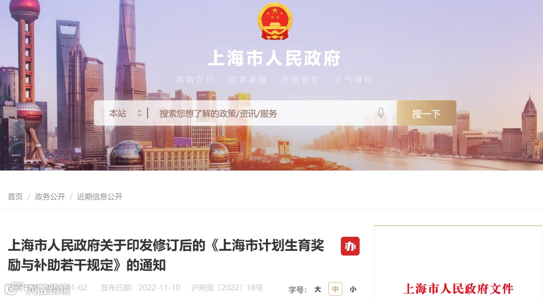 上海市政府印发修订后的《上海市计划生育奖励与补助若干规定》,自2022年11月1日起实施,有效期至2027年10月31日。