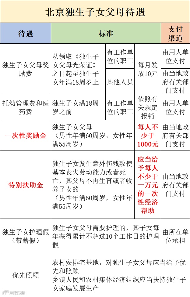(2)独生子女父母属国家机关、事业单位工作人员或者企业职工的,退休时由各自所在单位给予不低于1000元的一次性奖励。