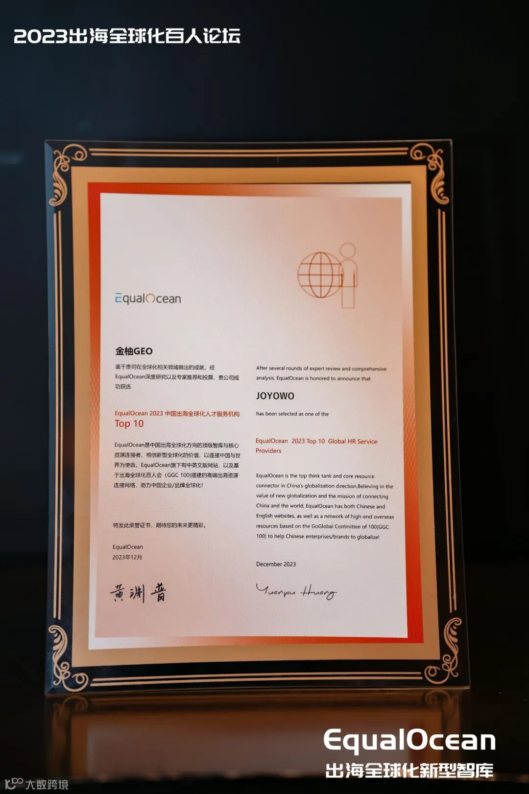 基于此,EqualOcean于论坛期间重磅发布《2023中国出海全球化方向人才服务机构 Top 10 榜单》。该榜单聚焦全球化人才服务机构,通过访谈、申报、实地调研等方式,分析了一系列严格的参数标准,包括分支机构数量、员工规模、自建人才数据库、营业收入增长率、服务覆盖海外国家数量、创新案例、声誉等,全方位地衡量了参评机构的规模、影响力和服务能力。金柚GEO在出海全球化领域的服务能力及实践成果得到认可,荣登该榜单。