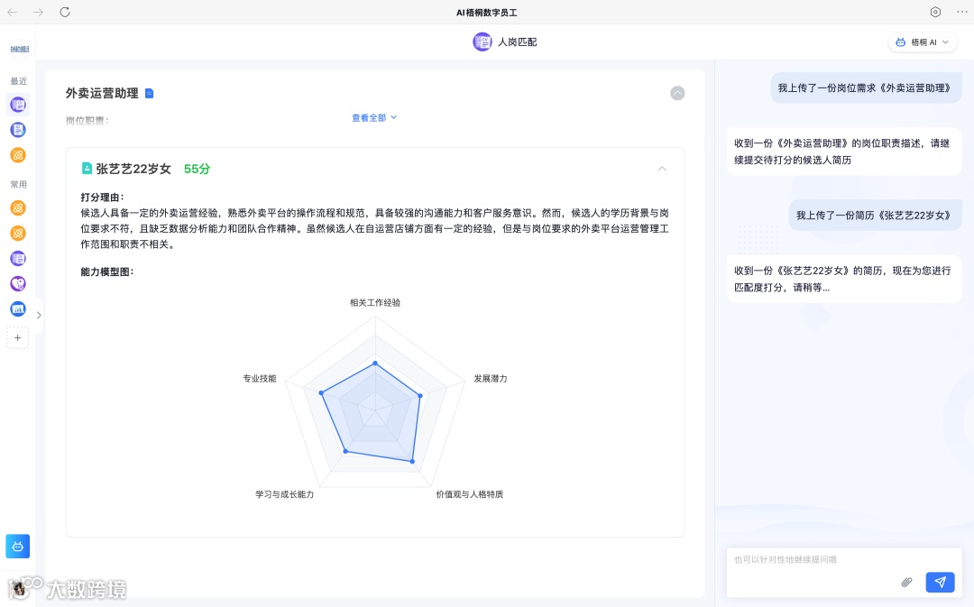 不再浪费时间手动筛选简历,不再为匹配合适的候选人而烦恼,梧桐数字员工的人岗匹配工具将成为您招聘过程中的得力助手。