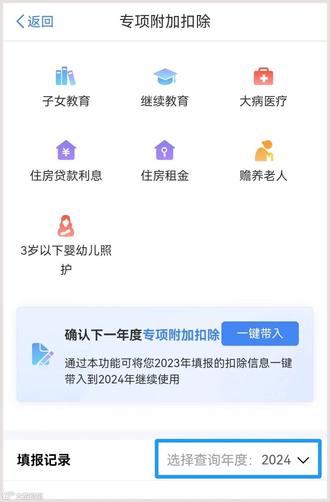 1.点击【专项附加扣除填报】,进入填报页面。【填报记录】选择【查询年度2024年】。