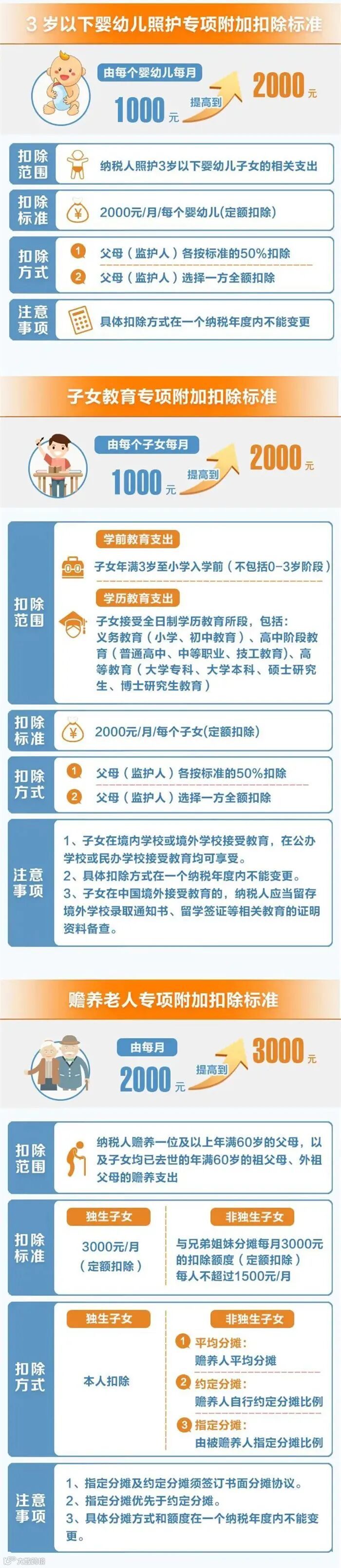 国务院发布《关于提高个人所得税有关专项附加扣除标准的通知》(国发〔2023〕13号),提高了赡养老人、子女教育、3岁以下婴幼儿照护三项专项附加扣除的标准。其中,赡养老人专项附加扣除标准,从每月2000元提高至每月3000元,子女教育、3岁以下婴幼儿照护专项附加扣除标准从每个子女每月1000元提高至每月2000元,纳税人从今年9月申报期起即可享受。