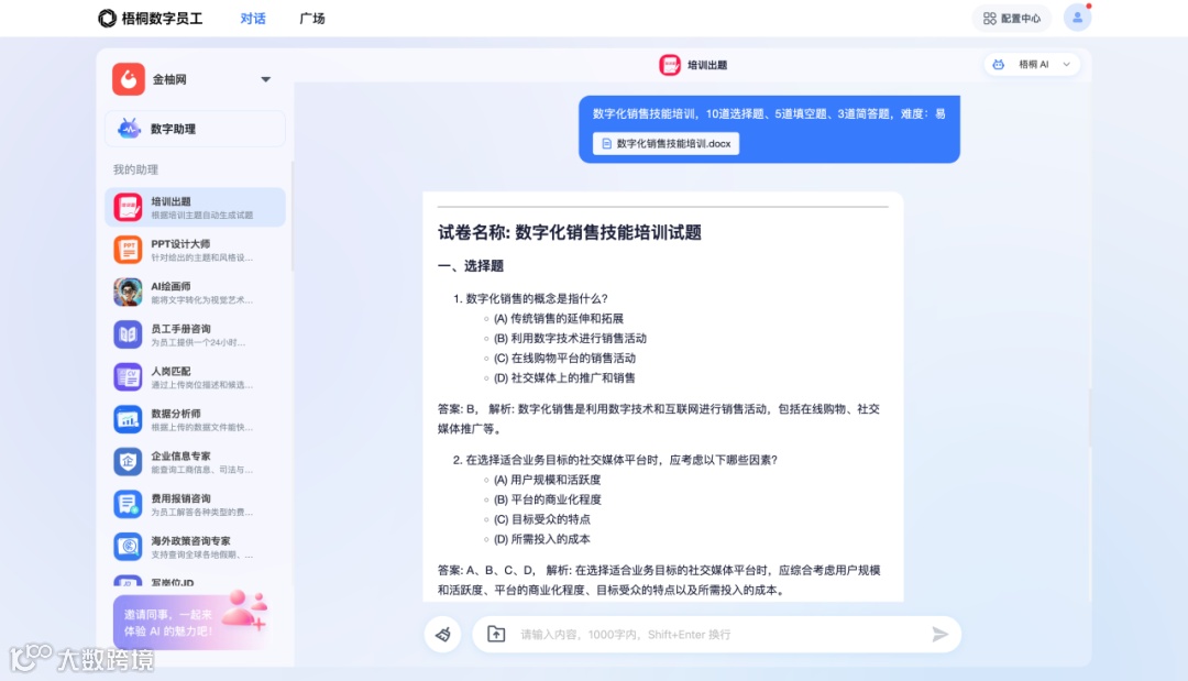 在完成授课培训后,梧桐数字员工还支持快速生成定制试题,精准评估员工对培训内容的掌握程度。