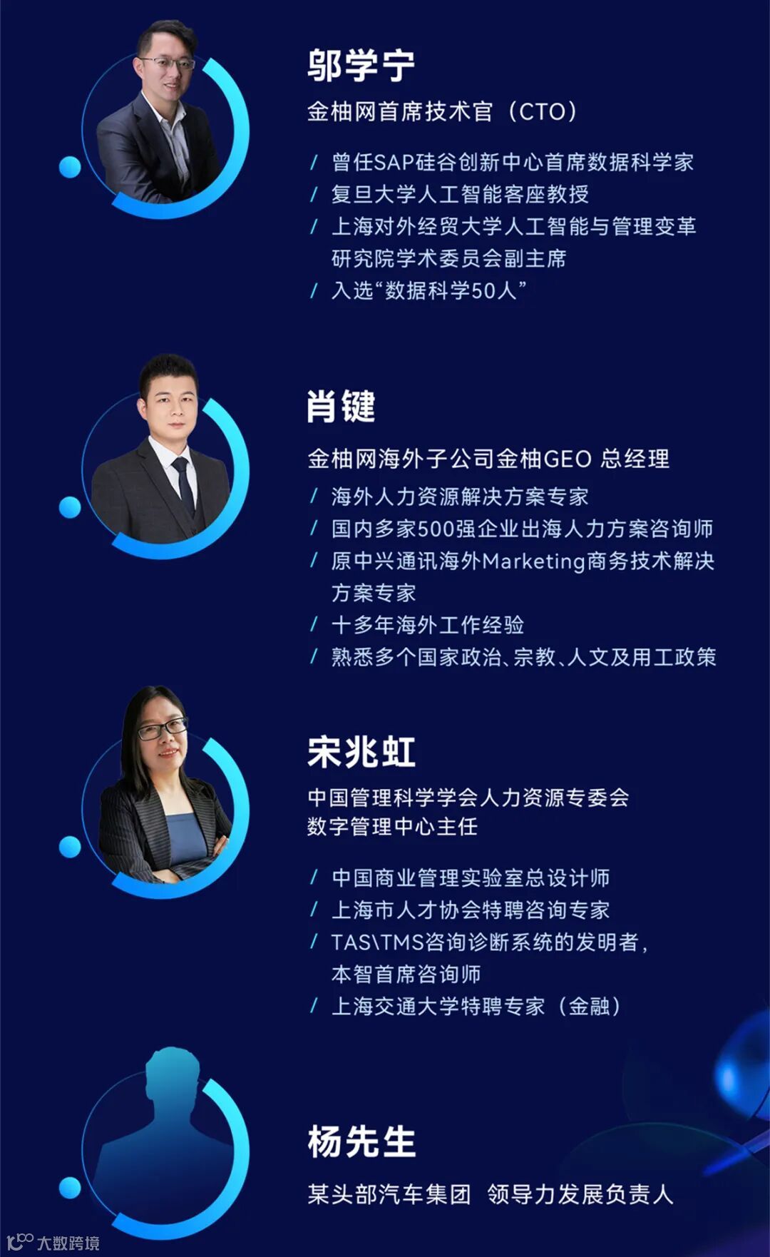 本届人博会上,金柚网举办的“数启新未来,全球新视野——2023企业出海人力资源服务高峰论坛”,特别邀请金柚网CTO邬学宁、海外业务子品牌金柚GEO总经理肖键,以及中国管理科学学会人力资源专委会数字管理中心主任宋兆虹,某头部汽车集团领导力发展负责人杨先生,汇聚全球500强、国内500强等名企的顶尖专家与资深人力资源精英。