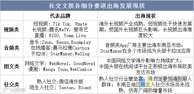 目前,社交文娱出海主要分为视频类、音频类、图文类和社交类这四个主要领域,各领域下设置了多个细分赛道,商业版图从东南亚、欧美延伸至中东、非洲、拉美,逐渐席卷全球。海外市场,正在成为厂商眼中的蓝海。