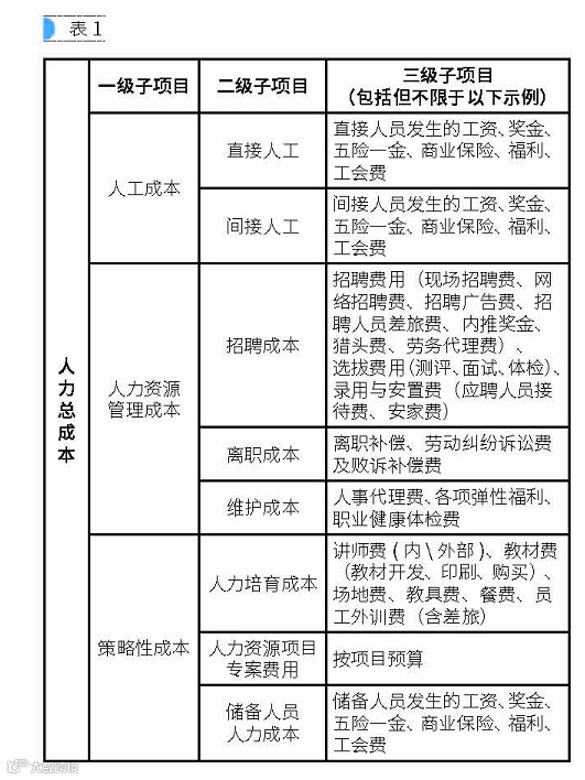 表1是较为常见的人力成本三级项目分类,不同企业根据各自的实际情况,在人力成本的项目分类及口径核算方面会有所不同。