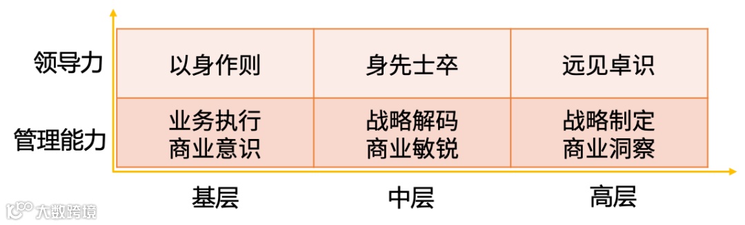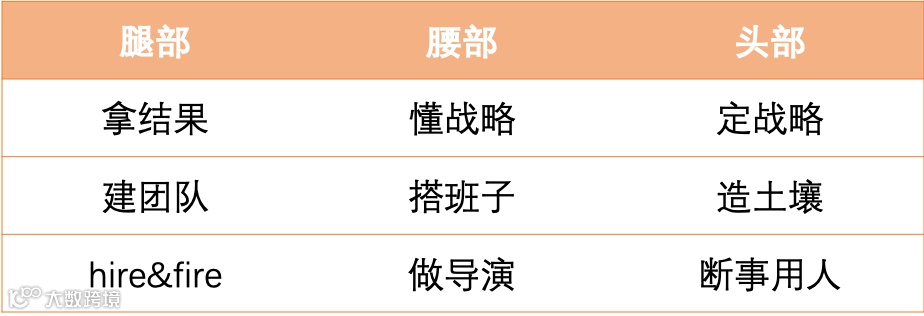 以阿里为例,腿部、腰部、头部管理者的工作重心有明显的区别,能力要求也会有区别。高层需要制定战略,对应的能力是战略规划制定;中层要懂战略,对应的能力是战略理解与解码;基层是拿结果,对应的能力则是业务执行。