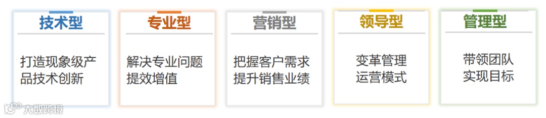 常见绘制人才画像职位有五种,分别是技术、专业、营销、领导和管理。如下: