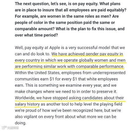 2021年首席执行官蒂姆·库克(TimCook)公开了苹果打破常规的做法:停止询问应聘者的薪酬历史,以确保岗位薪酬公平。活动期间,当投资者们提到“同岗同酬”时,库克表示:苹果公司在全球范围内平等地支付男性和女性员工薪酬,已停止询问应聘者的薪酬历史。