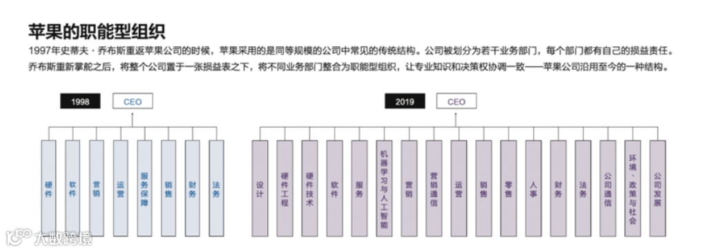 为了实现这样的创新,苹果依赖于一个以功能专长为中心的结构。它的基本信念是,那些在某个领域拥有最多专业知识和经验的人应该拥有该领域的决策权。苹果公司之所以多年来坚持职能型的组织,首先基于其技术变革率和技术颠覆率都很高的市场,另外一方面是把短期利润和成本目标作为评判投资和领导者的首要标准。因此职能型组织的基本原则就是让专业知识和决策权保持一致。
