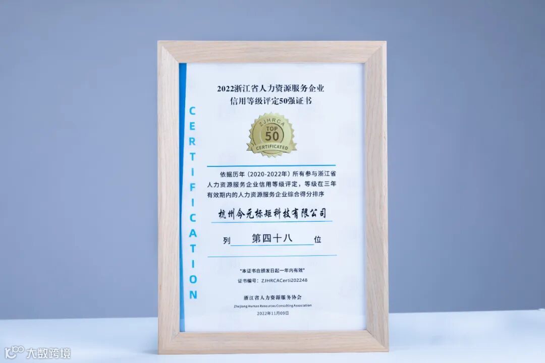 11月9日,由浙江省人力资源和社会保障厅指导,浙江省人力资源服务协会、杭州市人力资源和社会保障局共同承办的第十届暨2022中国(浙江)人力资源服务博览会于杭州盛大开幕。会上还举行了2022星级企业和信用50强企业颁证仪式,金柚网连续三年荣登“浙江省人力资源服务企业信用等级评定50强”榜单。