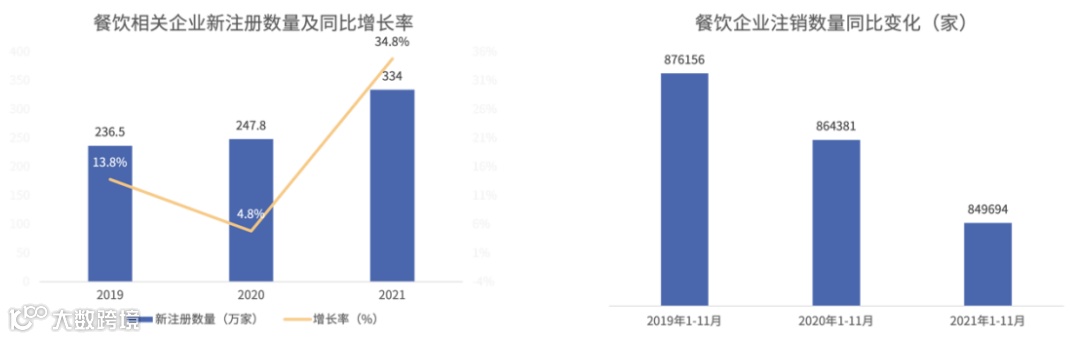 餐饮业连锁化率提升也体现在餐企相关企业新注册数量上,企查查数据显示2021年餐饮相关企业新注册量达到了新高峰——334万家,增长率达到34.8%。2021年餐饮企业注销数量下降则反映出连锁门店抗风险能力更强,经营管理水平更高,生命周期也长于个体餐饮经营户。