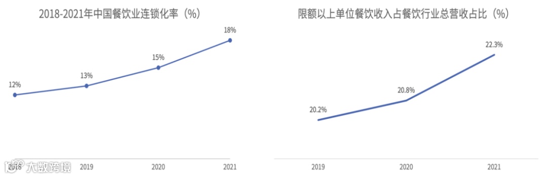 国家统计局数据显示,2019至2021年中国限额以上单位餐饮收入占餐饮行业总营收占比从20.2%上升至22.3%,连续3年上涨。美团研究院数据显示,2018至2021年中国餐饮业连锁化率从12%上升至18%,连续4年持续增长。